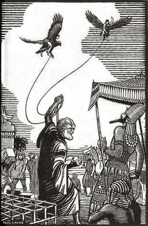 Immediately Akhiqar writes a letter to his wife Eshpagne to command his huntsmen to catch two young eagles; and command the workers in flax to make two ropes each the length of a thousand ells and as thick as one's finger. And to bid the carpenters to construct two cages for the eagles; and have two boys Ubael and Tabshelim who do not know how to talk, to teach them to say, "Give the builders mud, mortar, tiles, bricks, for they are idle." A practice session ensued wherein the boys sat in the cages on the backs of the eagles that were tied with the long ropes. After several days, the young eagles gained strength and the boys had learned their lines. King Sennacherib and his nobles marvelled at Akhiqar's ingenious device. Akhiqar bid farewell to the king and took his leave with a force of soldiers. He arrives in Egypt, goes to the king's gate where the nobles inform Pharaoh of the arrival of a man whom the king of Assyria has sent. Akhiqar and his men were given a place of residence. And on the following day he calls on the king, and in a dignified way inquires about his health, and tells Pharaoh that he was a servant in the Assyrian kingdom, and was sent by his King, Sennacherib, to fulfill your desire. Pharaoh marvelled at the eloquence and educated presentation of the messenger. "What is your name?" Pharaoh asked. "My name is Awikam, a contemptible ant of the Assyrian Kingdom" replied Akhiqar. "Am I so despised by your lord that he has sent me a despised ant of his kingdom?", Pharaoh said. The king then ordered Awikam to go to his residence and return early in the morning. Day one Day two Day three Day Four "Be it far from me, my lord the king, that I should make mention my lord Sennacherib, while you are seated", Awikam responded. Pharaoh was surprised at the daring and liberal statement Awikam uttered. The king then got up from his throne and said, "Now you can tell me." "My lord Sennacherib is like the God of Heaven and his nobles to the lightnings that are in the clouds; for when he wills, he fashions hail from the rain and the dew; and if he thunders, he restrains the sun from rising, and its rays from being seen; and he will restrain Bel from coming in and from going forth in the street (or market place), and his nobles from being seen; and he will stop the moon from rising and the stars from appearing." And when Pharaoh heard these things he was intensely angry, and said to Avikam, "By the life of your lord, tell me truly what is your name?" Awikam honestly answered and said, "I am Akhiqar, the Secretary and Great Seal of Sennacherib, King of Assyria and Nineveh." Then the king said to him, "Didn't I hear that your lord had killed you." Akhiqar said, "I am yet alive, my lord the king, and God saved me from something which my hands did not." Before the king dismissed Akhiqar, he told him to return the following day and to tell him a word which neither he nor his nobles, nor anyone in the city of his kingdom have ever heard. After some meditation, Akhiqar wrote the following letter: "From Pharaoh, King of Egypt, to Sennacherib, King of Assyria and Nineveh, greetings. Kings have need of Kings and brothers of brothers; and at this time my gifts are meager, because there is deficiency of money in my treasury. Command and send me from your treasury 900 talents of gold and in a short time I will return them to you." He folded the letter, and the following day he presented himself to Pharaoh, and said that perhaps in this letter there is a word that was never heard by you. When Akhiqar read the letter, the nobles cried out, as they were commanded to do, and said that this has been heard by all of us and it is so. The king was surprised to hear when the matter of the debt of 900 talents due to Assyria was brought to his attention. At this point the king said that he is planning to build a castle between earth and heaven, and to a height of 1000 fathoms. Akhiqar asked the king to have his workers prepare mortar, bricks, mud and tiles. He then produced the young eagles, bound ropes to their feet, mounted the little boys on their back, and up they flew in the sky. The boys were shouting, "provide mortar, bricks, mud and tiles for the builders because they are idle." The king, the nobles and the congregation gathered were all perplexed. Akhiqar then took a rod or staff and beat the king's nobles in order to provide building material, until they ran away. The king was angry with Akhiqar and said, "You are mad, and who can carry up anything to these boys?" Akhiqar responded by saying that if it is difficult for you to carry the building material up, then how can we build a castle in the sky. If my lord Sennacherib had been here he would have built a couple of castles in one day. The following morning Akhiqar presented himself to the king. Pharaoh said, "Akhiqar, explain to me how the horse of your lord neighs in Assyria, and our mares hear his voice here, and their foals miscarry." Akhiqar left the palace and commanded his servants to catch him a cat. He whips the cat in the streets of the city. The Egyptians report the incident to the king and say that Akhiqar mocks us. The king calls him in and says, "Why are you insulting us?" Akhiqar responds: "Last night this cat went to Assyria and tore off the head of the cock that had been entrusted to me by my lord, King Sennacherib, and returned." The king said "Akhiqar, you have grown old and absolutely mad. How could this cat, in a single night, go to Assyria which is a distance of 360 parasangs, cut the head of the cock and return?" Akhiqar said, "If the distance from Egypt to Assyria is 360 parasangs, how come your mares in this place hear the voice of the horse of my lord, and their foals miscarry?" Pharaoh then asks Akhiqar to expound on the following riddles: King: A pillar has twelve cedars on its head; each cedar has thirty wheels, and in every wheel two cables, one white and one black. Akhiqar: My lord, the king, even the ox-herds in our co