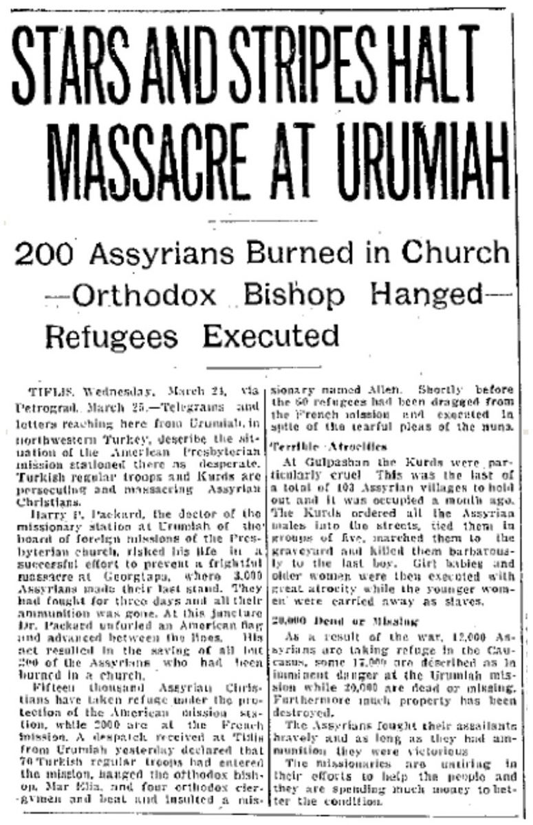STARS AND STRIPES HALT TIFLIS, Wednesday, March 21, via Petrograd, March 25 — Telegram and letters reaching here from Urumiah, in northwestern Turkey, describe the situation of the American Presbyterian mission stationed there as desperate. Turkish regular troops and Kurds are persecuting and massacring Assyrian Christians. Harry P. Packard, the doctor of the missionary station at Urumiah of the board of foreign missions of the Presbyterian church, risked his life in a successful effort to prevent a frightful massacre at Georgtapa, where 3,000 Assyrians made their last stand. They had fought for three days and all their ammunition was gone. At this juncture Dr. Packard unfurled an American flag and advanced between the lines. His act resulted in the saving of all but 200 of the Assyrians who had been burned in a church. Fifteen thousand Assyrian Christians have taken refuge under the protection of the American mission section, while 2000 are at the French mission. A dispatch received at Tiflis from Urumiah yesterday declared that 70 Turkish regular troops had entered the mission, hanged the orthodox bishop, Mar Elia, and four orthodox clergymen and beat and insulted a missionary named Allen. Shortly before the 60 refugees had been dragged from the French mission and executed in spite of the tearful pleas of the nuns. Terrible Atrocities At Gulpashan the Kurds were particularly cruel. This was the last of a total of 103 Assyrian villages to hold out and it was occupied a month ago. The Kurds ordered all the Assyrian males into the streets, tied them in groups of five, marched them to the graveyard and killed them barbarously to the last boy. Girl babies and older women were then executed with great atrocity while the younger women were carried away as slaves. 20,000 Dead or Missing As a result of the war, 12,000 Assyrians are taking refuge in the Caucasus, some 17,000 are described as in imminent danger at the Urumiah mission while 20,000 are dead or missing. Furthermore much property has been destroyed. The Assyrians fought their assailants bravely and as long as they had ammunition they were victorious. The missionaries are untiring in their efforts to help the people and they are spending much money to better the conditions. |