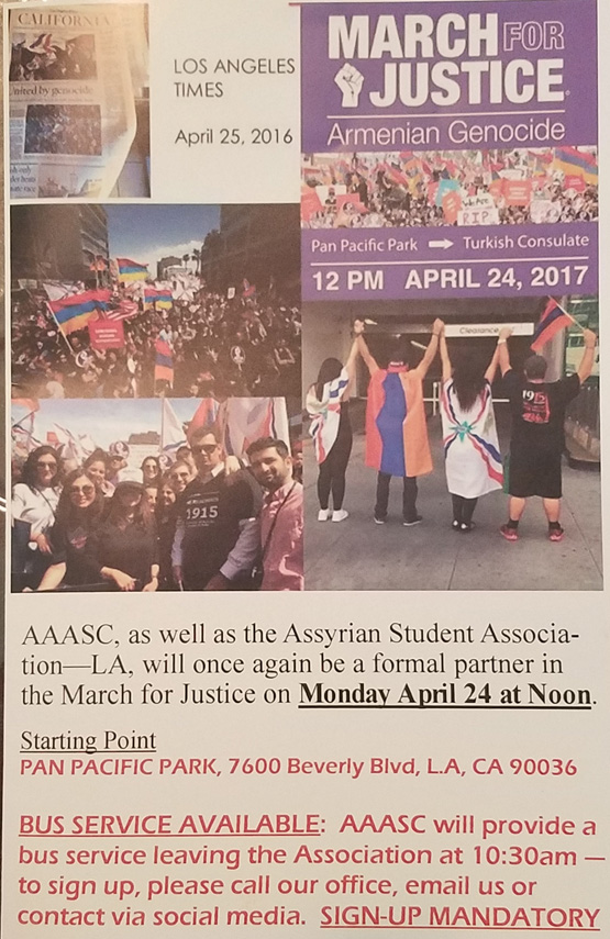 March for Justice: Armenian Genocide. Starting Point: Pan Pacific Park, 7600 Beverly Blvd. Los Angeles, California 90036 on Monday, April 24, 2017 at 12:00 Noon.