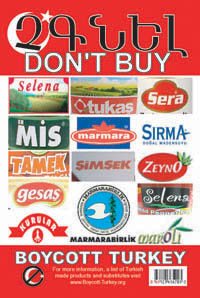 The goal of the boycott is to bring economic pressure to the Republic of Turkey by boycotting Turkish made goods and tourism to Turkey.