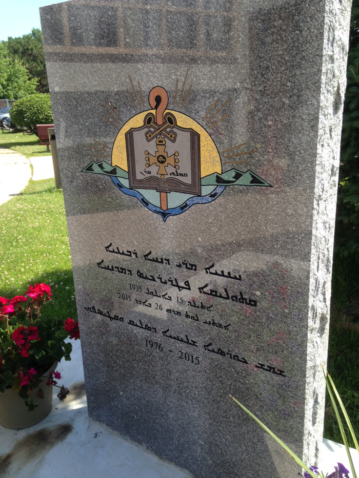 A much unadorned grave of the previous Patriarch Mar Eshai Shimun in Turlock, California is shown below. The headstone of the exiled and later assassinated patriarch includes inscriptions in Assyrian on one side and English on and the other side. The headstone is of the same size and height of the neighboring graves.