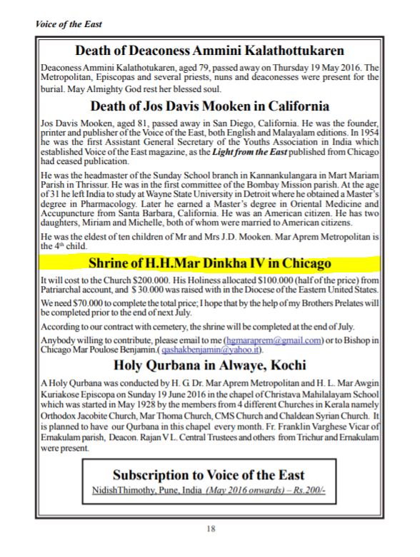 Meanwhile, at St. Mary’s Church, in Roselle, Illinois, a large picture of the late patriarch is on the wall to the right as one enters the church lobby. Meanwhile, to the left, a smaller picture of the new patriarch Mar Giwargis is in display.