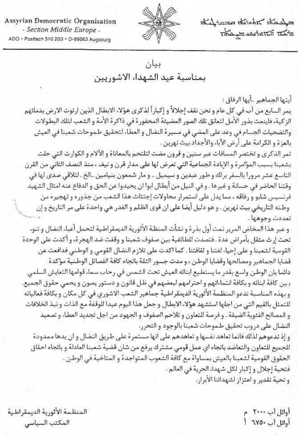 (Forwarded by Joni Jokhaji for the Assyrian Democratic Organization, ADO)