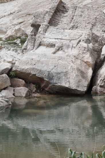 Figures of the ancient wall relief are now lying in the river bank; bullet holes have desecrated the figures and the remains of the cuneiform inscriptions.