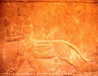 Lamassu is a form of mythical creature with mixed composition, it is more often a winged bull with a man’s head and a lion's paws (photo No.1), or with a man’s head and a bull’s feet (photo No.2) – Lamassu took several forms during the different periods of history, even in Assyria (Ashur), it took at times the form of a non-winged lion with a human’s hands dedicated for protection during a bath (the ancient Assyrian beliefs say that sprinkling or stirring hot water attracts the "Pazzuzu" <5> (photo No.3) or the evil spirit), and women to this day spontaneously continue to use the word “kish” to expel evil spirits whenever they sprinkle or stir hot water, this winged lion is called in Assyrian "Ormalolo”, a plate with an Ormalolo was found in the bathing area of King Ashur Bani - Apli (Banipal) dating back to 640 B.C. (photo No.4).