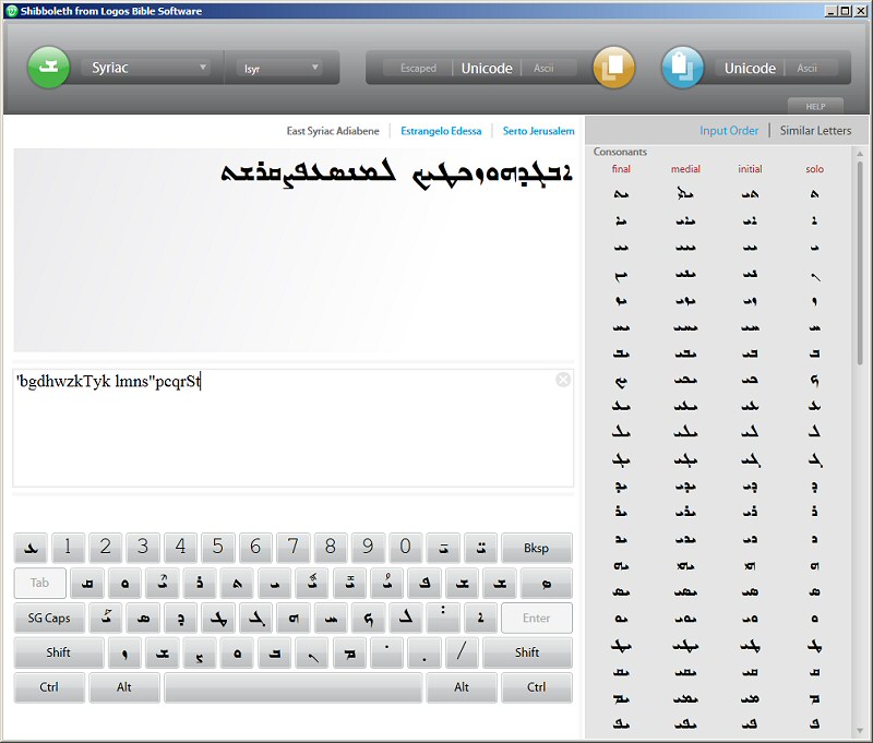 Shibboleth is a tool for typing Unicode text in ancient scripts. It was designed to help people unfamiliar with a script easily enter the correct characters, and then copy text to the clipboard in Unicode or another format.