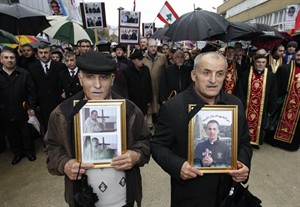 Men hold up pictures of Iraqi Christian priests killed in an attack in Baghdad, during a demonstration in support of Iraq's Christian minority in Brussels, Saturday, Nov. 13, 2010. The priests were killed Sunday, Oct. 31, 2010 when gunmen stormed a church during mass and took the entire congregation hostage. The attack, claimed by an al-Qaida-linked organization, was the deadliest recorded against Iraq's Christians since the 2003 U.S.-led invasion unleashed a wave of violence against them. (AP Photo/Yves Logghe)