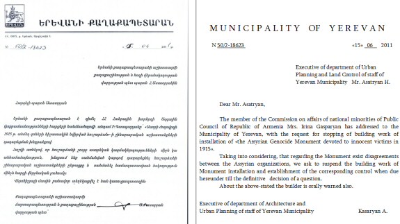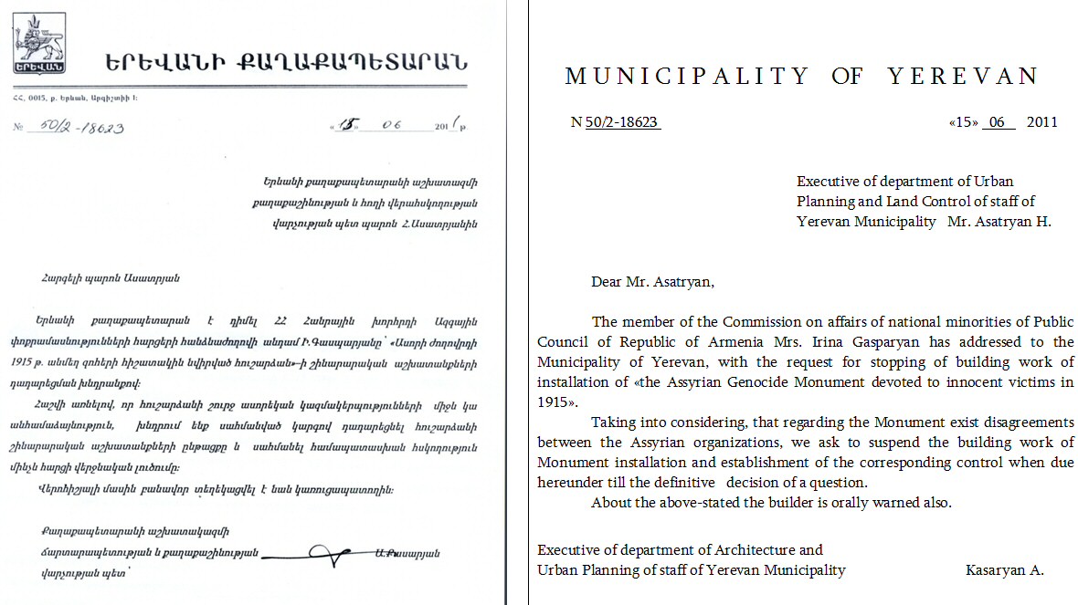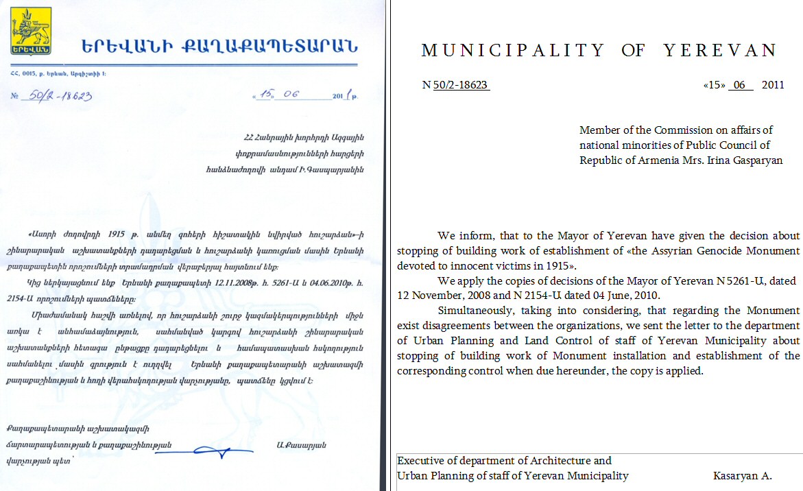 Months of effort of the Commission and sincere friends of the Assyrian Nation from among representatives of other nationalities realizing all importance and depth of this project are finally crowned with success. 15th June 2011, the Municipality of Yerevan in written form informed about stop of the construction of the Monument. Below is the documents and their translation.