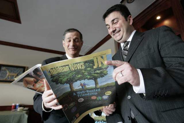 Detroit Jewish News publisher Arthur Horwitz, left, of West Bloomfield and Chaldean News co-publisher Martin Manna of Bloomfield Township flip through a compilation of the content from their publications that helped launch the Building Community Initiative. / Photos by PATRICIA BECK/Detroit Free Press