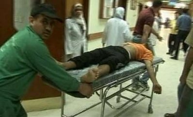 A wounded man lying on a stretcher is taken to a hospital ward in Baghdad April 24, 2011 in this still image taken from video. A roadside bomb exploded near the rear entrance of a Catholic church in Baghdad after Easter services on Sunday, wounding at least two police officers and two civilians. The bomb blew up outside Sacred Heart church in Baghdad's central Karrada district, shattering windows in nearby buildings and severely damaging a police pick-up truck at the church gate. REUTERS / Reuters TV