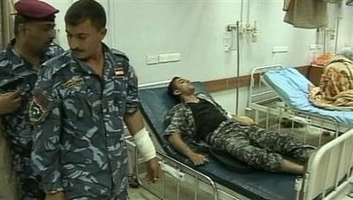 A wounded policeman stands near another lying on a hospital bed in Baghdad April 24, 2011 in this still image taken from video. REUTERS / Reuters TV