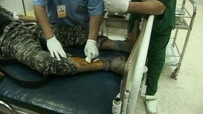 Medics clean the wound of an injured policeman at a hospital in Baghdad April 24, 2011 in this still image taken from video. A roadside bomb exploded nearthe rear entrance of a Catholic church in Baghdad after Easter services on Sunday, wounding at least two police officers and two civilians. The bomb blew up outside Sacred Heart church in Baghdad's central Karrada district, shattering windows in nearby buildings and severely damaging a police pick-up truck at the church gate. REUTERS / Reuters TV