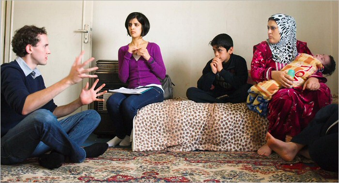 This January 2010 photo released by the Iraqi Refugee Assistance Project shows student project director Stephen Poellot, left, a student at Yale Law School, and Aseel Zahran, second from left, a project volunteer in Jordan, working with an Iraqi family on their resettlement case in in Amman, Jordan. The group reports it has helped resettle more than 400 Iraqi refugees in the United States, Canada, Australia, Germany, Ireland and Sweden. (AP Photo/Iraqi Refugee Assistance Project, Susannah Stevens)
