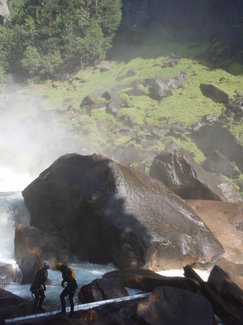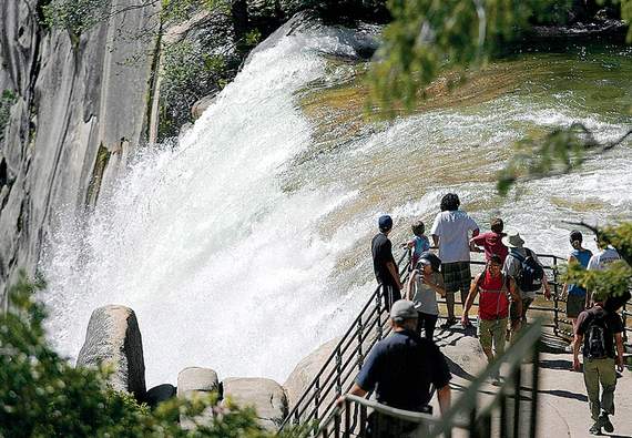 Hikers on the Mist Trail to Vernal Fall in Yosemite are seen Wednesday July 20, 2011. Two men and a woman crossed a metal barricade above the 317-foot Vernal Fall on Tuesday, making their way over slick granite to a rock on the edge of the swift Merced River trying to pose for a picture. Instead they burned a horrifying image into the memories of everyone who saw. (AP Photo/GosiaWozniacka)