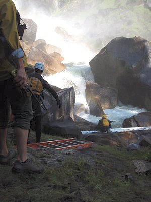 In this photo released by Yosemite National Park on Saturday, Aug. 6, 2011, members of a search and recovery team participate in the recovery of the body of a hiker who was swept over Vernal Fall with two companions. The body was recovered Friday, park officials said, and the search for the two others continued.