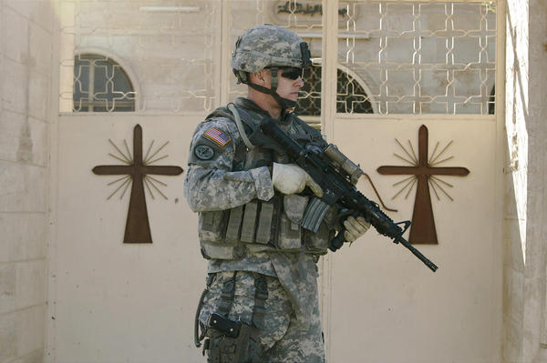 U.S. Army Sgt. Christopher Nelson walks beside a Christian church on patrol in Tal Kaeef, Iraq. Photo: Associated Press (AP)