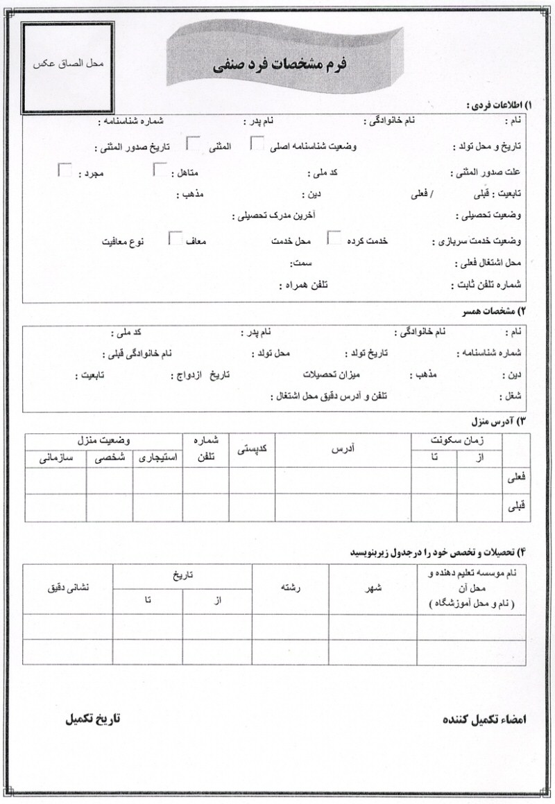 | It is being said that Iranian police have given the form shown in the picture above to trade unions. When anyone goes to meet with the trade union, they, as well as their companions, are asked to complete this form. Source: Mohabat News | Iran to gather more information and tighten its control over religious minorities by Mohabat News, Iranian Christian News Agency. August 30, 2012.Some reports and documents reveal that trade unions are seeking to gather information about religious minorities to help the government increase its pressure on Iranian citizens, especially religious minorities. Religious minorities in Iran have been facing various kinds of discrimination and legal restrictions since the Islamic revolution in 1979. According to Mohabat News, the Human Rights Activists News Agency reported that Iranian authorities have attempted to gather information about religious minorities, especially Baha'is through syndicates in Shiraz. It is being said that Iranian police have given the form shown in the picture above to trade unions. When anyone goes to meet with the trade union, they, as well as their companions, are asked to complete this form. Opponents said, "what do our spouse's personal information, current and past addresses and the condition of our place of residence have to do with the union?" It should be said that trade unions are only asked to obtain professional and not personal information about their members. No doubt, such actions by the Iranian government cause Iranian citizens, especially religious minorities, to be identified and further controlled. Further control over religious minorities in Iran Various sources tell of intensified pressure by the Religions Department of the Intelligence Ministry of the Islamic Republic against Armenian dioceses, associations and organizations affiliated with Armenian, Jewish, Zoroastrian and Assyrian religious and ethnic minorities. According to published reports, the Revolutionary Court as well as the Intelligence and Security police of Tehran sent warning notices to the offices of parliament members representing religious and ethnic minorities asking them to obtain reports and information about some religious minorities immigrants and suspicious regime opponents and their families inside Iran. This is while the Intelligence Ministry of the Islamic Republic with the assistance of the Ministry of Communication and Technology, has compiled a list of phone numbers registered under Jewish, Armenian and Assyrian names and constantly spies on them by listening to their conversations. Also we hear many reports indicating religious minorities' representatives in the Islamic Parliament of Iran cooperate with the Ministry of Intelligence. A news source inside the country, also told Mohabat News that traces of a religious minorities representative can be seen in the closure of some churches as well as the banning of Farsi-speaking Christians from entering official churches. According to the report it is rumored that this member of Iranian parliament had confidential dealings with the Executive Secretary of the evangelical church and thus was able to bring a very special place of worship for Persian Christians under the government's control. Religious minorities living in Shiraz Shiraz, the capital of Fars province, is one of the largest cities of Iran and is a place where numerous religious minorities including Christian converts live. The religious minorities in this city as well as all across the country are subjected to harassment and are being prosecuted by the judicial system of the Islamic Republic. According to published reports, two religious minority communities, namely Christians and Baha'is residing in the city have had no good days since February 2012, for they are severely pressured and harassed by the intelligence office of that city. As the published reports reveal, the security authorities raided a house church in Shiraz and arrested ten Christian converts who had gathered for worship. Fariba Nazemian, Mojtaba Hosseini, Homayoun Shokouhi, Mohamad-Reza Partoei (Koorosh) and Vahid Hakkani were among those arrested. All these Christian converts are still being held in prison with their fate unknown. For more than six month they have been imprisoned in Adel-abad prison in Shiraz. Although their judicial status is still unknown, what is clear is that their only crime is their faith in Christianity. Also, about the same time as these Christians were arrested, the homes of 30 Iranian Baha'is residing in Shiraz were also attacked by security authorities and 11 of them were arrested. According to the "Baha'i Community" News service, security authorities had arrest warrants for 21 of them, but they could not arrest all 21 Baha'i because not all of them were present at that time. Among those Baha'is arrested was a mother and her 9 month old baby who were released in the evening of the same day together with two other Baha'is.