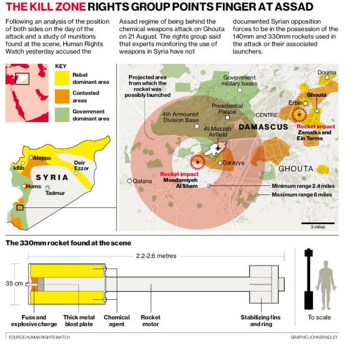 Testimony from residents of Ghouta – not all of them supporters of the rebels – together with maps they provided, some of them hand-drawn, calls these scenarios into question. They repeatedly recounted separate landings of “chemicals” at Kafr Batna, Zayina, Ein Tarma, Zamalka, Ain Tarma and Moadamiyeh Al Sham, at varying times, pointing out that a single home-made rocket could not have carried out multiple strikes.