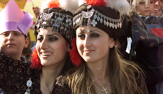 Syrian and Iraqi Assyrian Christians women celebrate their new year in Damascus with folk dances and songs, April 1, 2004. (photo by REUTERS/Khaled al-Hariri)
