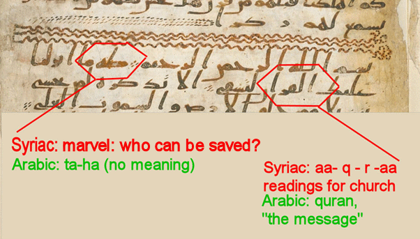 Parchments collected by Alphonse Mingana have recently been radiocarbon dated to 568 – 645 CE, and appear to show the influence of Assyrian Christianity on early Muslims. The pages are in the University of Birmingham UK, where they are being studied using Luxenberg's Aramaic method. Of particular interest is whether the "kaf, ha, ya, ayn, saad" in Maryam might mean "pain" and "the Magnificat" in Aramaic.