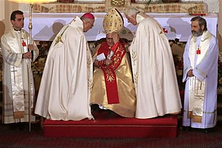 Priests bless Louis Sako, 64, the new patriarch of Iraq's Chaldean Catholic Church at St. Joseph's Church in central Baghdad, Iraq, Wednesday, March 6, 2013. Iraq's Chaldean Catholic Church enthroned a new patriarch during a ceremonial mass Wednesday that was held amid tight security in Baghdad. (AP Photo/ Karim Kadim)
