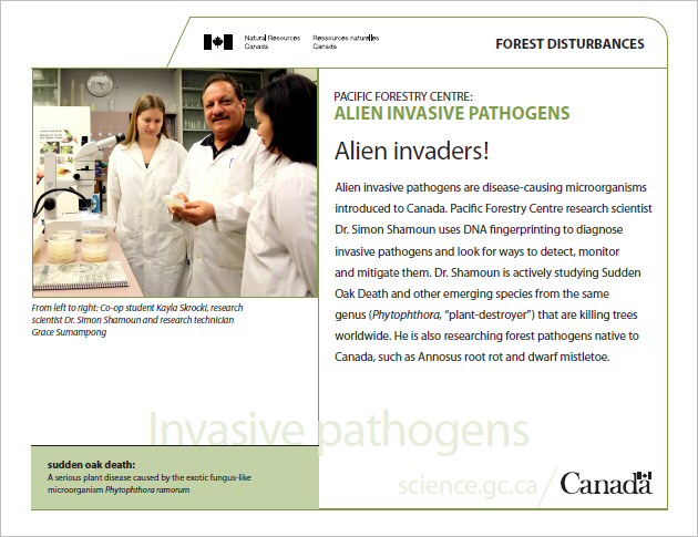 Alien invasive pathogens are disease-causing microorganisms introduced to Canada. Pacific Forestry Centre research scientist Dr. Simon Shamoun uses DNA fingerprinting to diagnose invasive pathogens and look for ways to detect, monitor and mitigate them. Dr. Shamoun is actively studying Sudden Oak Death and other emerging species from the same genus (Phytophthora, “plant-destroyer”) that are killing trees worldwide. He is also researching forest pathogens native to Canada, such as Annosus root rot and dwarf mistletoe.