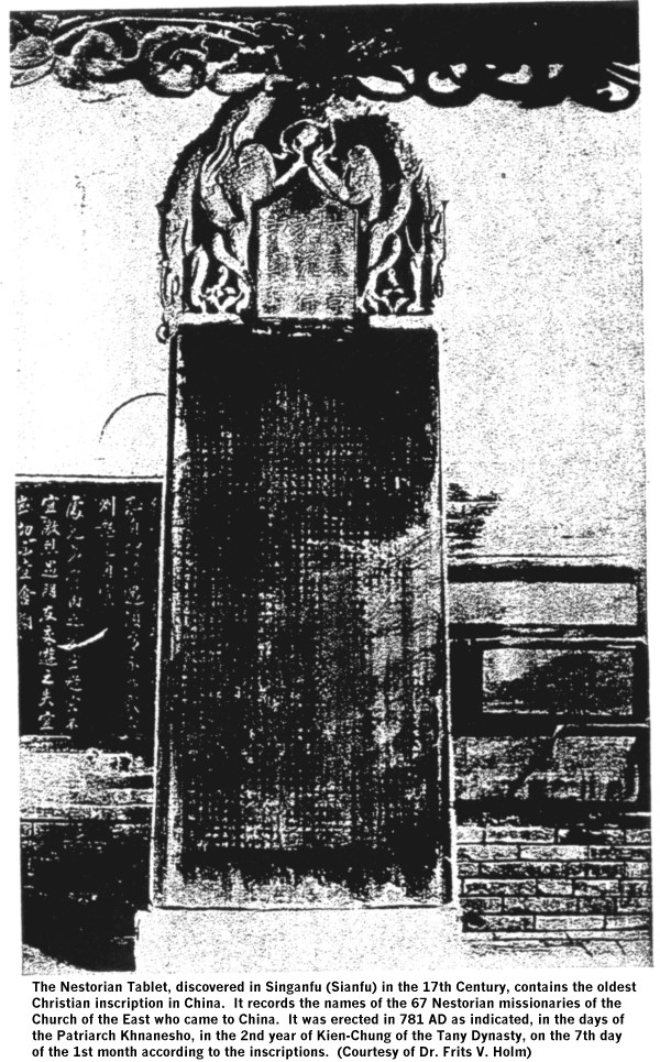 781: The Nestorian Tablet The Nestorian Tablet, discovered in Singanfu (Sianfu) in the 17th Century, contains the oldest Christian inscription in China. It records the names of the 67 Nestorian missionaries of the Church of the East who came to China. It was erected in 781 AD as indicated, in the days of the Patriarch Khnanesho, in the 2nd year of Kien-Chung of the Tang Dynasty, on the 7th day of the 1st month according to the inscriptions. (Courtesy of Dr. Frits V. Holm)