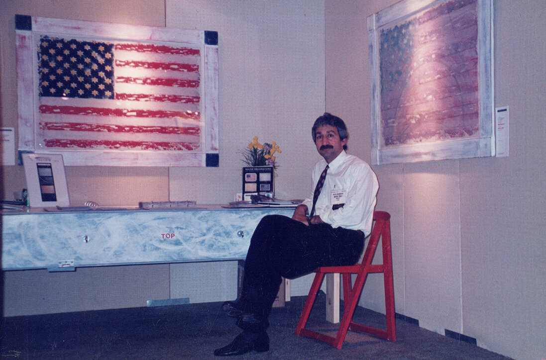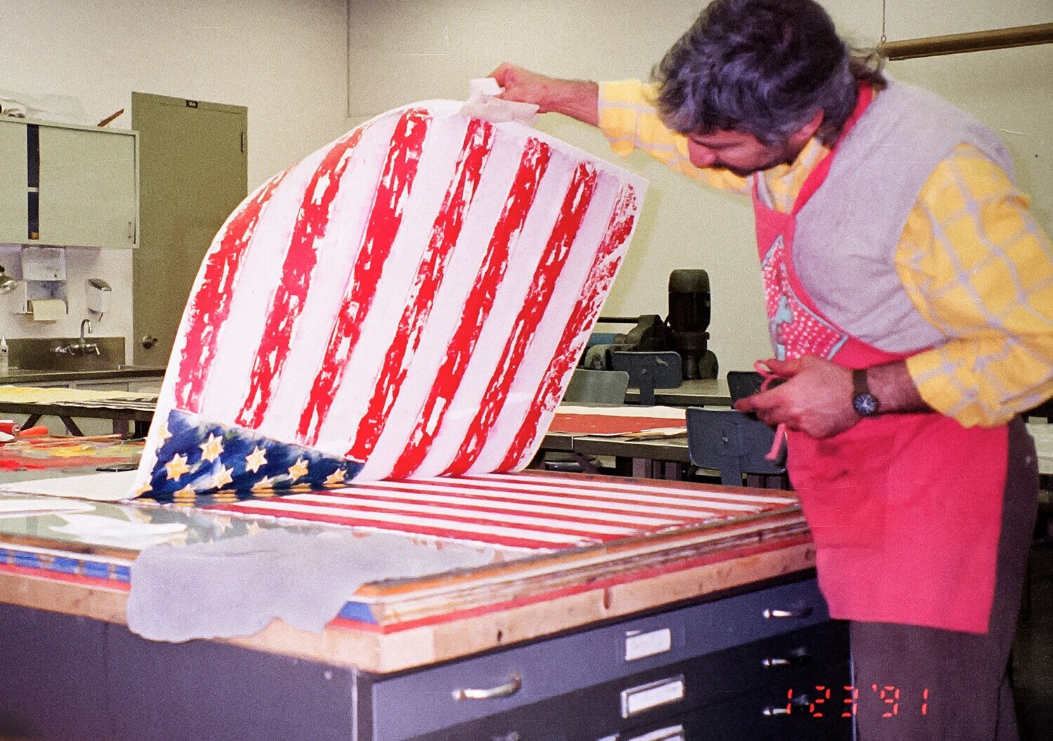 While at Cal State Fullerton he discovered printmaking and studied with Maurice Gray. From the moment he discovered the printing press, he knew he had found the medium for creating art, especially flags, inspired by the US flags at the New York City airport upon his arrival in 1978. He worked on the first plate for nearly six months and would come to the studio to print the flags at night, creating what would become the first monoprint in the envisioned series titled New Shades of Old Glory™. At the year-end class critique, there was no response from the class about the flags. The flag monoprints went into a drawer, and after finishing his studies, he moved on to start a fine art gallery and custom framing shop, Square i Gallery, in 1989 and focused on building his business. In 1991, he decided to exhibit the flag monoprints at the Art Expo in New York City. At that event, seven of them were sold, and an additional six works were sold later that year at an exhibition in a Las Vegas gallery. In a press interview at the time, the reporter implied that through the flags, he was only wanting to profit from the Middle East conflicts, but that was not at all the case. Marodeen showed his American flags series one more time in March 1996 at the New York Expo. This series was very personal for him and he then decided he did not want to continue selling the original monoprints. The flags went back into the drawer, where they remained until 2021. Realizing that the new giclée printing process would allow him to retain the original monoprints and still be able to share his flags led him to bring the flags out from the drawer and begin again to work on the series. With hundreds of notes, sketches, and doodles accumulated to develop the remaining flags in the series, he has begun printing again. The goal is to complete a series of 99 flags and offer each one as giclée prints.